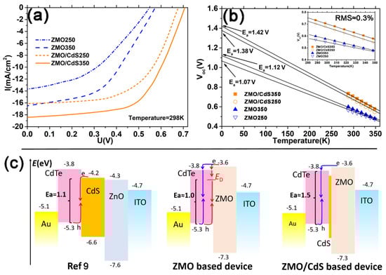 In order to distinguish the recombination pathway of the CdTe QDs solar device based on different window layers, the Voc was measured as a function of temperature in the range of 288–348 K, which is shown in Figure 7b. The ideal expression of the open-circuit voltage is