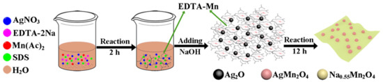 The formation mechanism of AgMn2O4@Na0.55Mn2O4 nanolamellar structure is shown in Figure 1. When EDTA-Na2 was added to an Mn(Ac)2-AgNO3 mixed solution, it was easier to generate a stable EDTA-Mn complex due to the relatively large coordination constant Kf (lgKf = 13.87) between Mn2+ and EDTA. However, the coordination constant Kf of EDTA-Ag formed by Ag+ and EDTA was relatively small (lgKf = 7.32). When the precipitant NaOH was added, free Ag+ would first precipitate with NaOH to generate AgOH and further dehydrate to form black Ag2O nanoparticles. Conversely, the precipitation process generated by Mn2+ and NaOH was slow for a large coordination equilibrium constant Kf. AgMn2O4 was formed and intercalated onto the growing Na0.55Mn2O4 nanosheet by the reciprocal actions between Ag2O nanoparticles and EDTA-Mn. Owing to the in-situ growing process, the AgMn2O4 and Na0.55Mn2O4 interacted with each other by intermolecular forces. The formation of a heterojunction structure could lead to excellent structural stability, which would allow the electrode to maintain good electrochemical performance during the charge-discharge process.