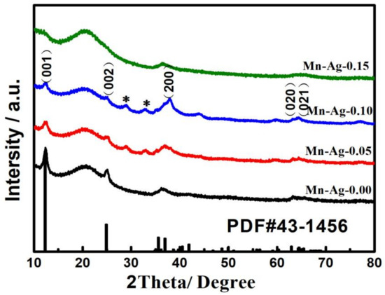 It is noted from Figure 2 that the XRD patterns of Mn-Ag-0.00, Mn-Ag-0.05, Mn-Ag-0.10, and Mn-Ag-0.15 show obvious diffraction peaks, attributed to the Na0.55Mn2O4 (PDF#43-1456). The XRD patterns of Mn-Ag-0.05 and Mn-Ag-0.10 present the minor peaks of the impurities indicated by the asterisk, which were indexed to AgMn2O4(PDF#16-0740). However, the diffraction peaks for Na0.55Mn2O4 and AgMn2O4 weakened and no AgMn2O4-related peaks were detected as the molar ratio of silver to manganese increased to 15% (Mn-Ag-0.15). From this phenomenon, it is speculated that silver had a great effect on the crystallinity of Na0.55Mn2O4 by affecting the ion as a liquid, and the Na0.55Mn2O4 directly related to the formation of AgMn2O4.