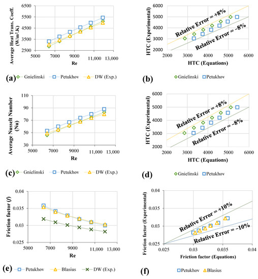 The Nuavg and heat transfer coefficients (h) obtained with the data from Equations (7)–(9) are disclosed in Figure 6a–c. The data demonstrated outstanding agreement between the present findings and equations such as <8% with the Petukhov formula. The Gnielinski equation is better at low-range Re than the Petukhov equation at higher Re-values [43]. Figure 6b–d demonstrated the relative errors between the collected and equations data for average heat transfer coefficients and Nuavg.