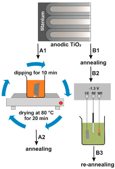 Synthesis of nanostructured Fe2O3–TiO2 by impregnation (A1) and electrochemical deposition (B2).