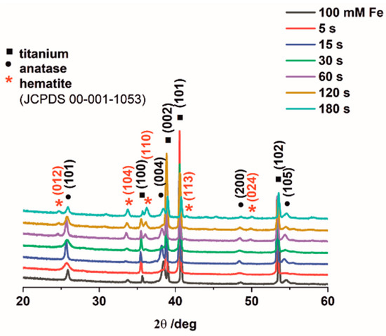 X-ray diffraction measurements were performed to characterize the crystal structure of obtained samples. The XRD patterns (Figure 3) of the prepared materials exhibited three main components. The main diffraction peaks correspond to the reflection from (100), (002), (101), (102) titanium (JCPDS card no. 05-0682) crystal planes and (101), (004), (200), (105) anatase (JCPDS card no. 21-1272) crystal planes. It can be seen that hematite peaks were not observed for the sample electrodeposited for 5 s due to a very low quantity of iron (ca. 0.5 at.%). However, for the samples electrodeposited for longer durations, such as 15 s and 30 s, (104), (110) crystal planes of rhombohedral hematite (JCPSD card no. 00-001-1053) are clearly visible. When compared with the impregnated sample, the materials electrodeposited for 60 s, 120 s, and 180 s, all having much higher Fe contents, revealed the presence of additional crystal planes of (012), (113), (024) that correspond to hematite.