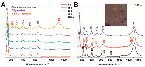 Raman spectra of the Fe2O3–TiO2 samples obtained by electrodeposition for 5–120 s (A) and 180 s (B). The colors of different areas on the picture correspond to the colors of the Raman spectra.