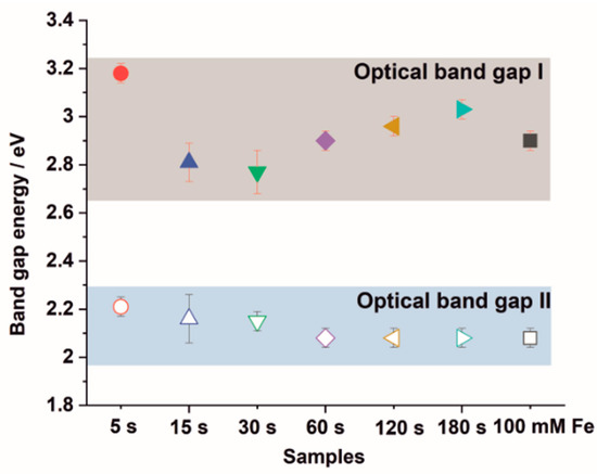 For all studied samples, optical band gap values were determined from diffuse reflectance measurements, as described previously [27,28]. An example of the estimation of the optical band gap energy from UV-Vis DRS measurements is presented in Figure S3 in Supplementary Materials. The obtained data for all studied materials are collected in Figure 5. It can be seen that two optical band gaps can be determined for all samples. The first band gap energy of ~3.2 eV, observed for the material obtained after 5 s deposition, is related to the electronic transitions in the crystal structure of TiO2 nanotubes (anatase) [30]. For the extended deposition process, band gap narrowing is observed, probably due to a heterogeneous morphology of Fe2O3–TiO2 and the formation of a heterojunction, which was observed in our previous work [27,28]. On the other hand, a second energy band gap of ~2.2 eV located in the visible region of the solar spectrum was calculated for the studied samples and is related to the presence of hematite [31].