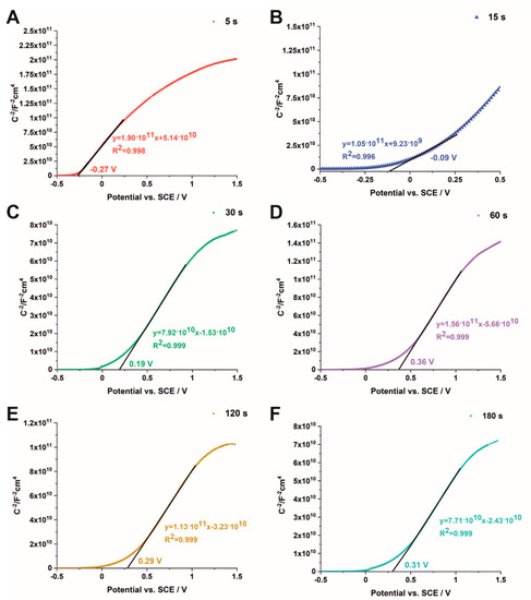 where: Csc is the capacitance of the space-charge region (F cm−2), Nd is the donor density (cm−3), ɛ is the dielectric constant of TiO2 (100), ɛ0 is the permittivity of free space (8.85∙10−14 F cm−1), q is the electron charge (1.602∙10−19 C), E is the applied potential (V), Efb is the flat band potential (V), T is the absolute temperature (K), and k is the Boltzmann constant (1.38∙10−23 J K−1) [32]. The Mott–Schottky analysis was performed at frequencies of 200, 500, and 1000 Hz. The flat band potential was obtained from the intersection of the Csc−2 vs. applied potential curve. The n-type behavior of the studied materials was confirmed by the positive slopes of the above-mentioned curves [33]. The Mott–Schottky plots measured at the frequency of 1000 Hz are presented in Figure 6 for samples obtained by electrodeposition for 5 s (A), 15 s (B), 30 s (C), 60 s (D), 120 s (E), and 180 s (F). As can be seen, with increasing the deposition time from 5 s to 180 s, the flat band potential shifts toward more positive potentials from −0.27 to 0.31 V vs. SCE, respectively. For the hybrid materials received by efigurelectrodeposition for 60 s, 120 s, and 180 s, the slight differences in Efb values are attributed to changes in the surface chemistry of TiO2 and concomitant modification of the surface states mediating the charge transfer across the material [34,35]. The above-mentioned results are consistent with the data in the literature, which typically report the flat band potential of hematite ranging between 0.16 V and 0.56 vs. SCE [36]. What is more, a good linear fit of the Mott–Schottky plot indicates a partially depleted space-charge layer at the semiconductor surface [37,38]. As an example, Mott–Schottky plots for three different frequencies (200, 500, and 1000 Hz) are shown in Figure S4 in Supplementary Materials for the sample electrodeposited for 5 s. As can be seen, the flat band potential of the hybrid material shifts from −0.27 to −0.02 V vs. SCE as the applied frequency changes from 1000 to 200 Hz, which can be attributed to the high crystallinity and porosity of the electrode as well as the presence of the metal component [22,27].
