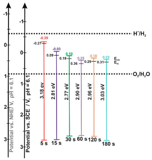The average donor densities of the studied samples were calculated based on Mott–Schottky measurements, as described earlier [27,28] Equation (S1) in Supplementary Materials for all tested frequencies (Figure S5, Supplementary Materials). As can be noticed, the donor density increases with increasing deposition time (except for the samples electrodeposited for 5 s and 30 s), which can be related to increasing the film thickness in a manner that depends on the substrate and its morphology, as suggested by Sellers and Seebauer [39]. The increased donor concentration reduces the width of the space-charge layer and, consequently, the electric field across the space-charge layer is larger. As a result, charge carriers within this region are efficiently separated and their recombination is inhibited [38]. It is worth noting that the dopant concentration should not be too high because it would provide more defect-scattering/recombination properties, which can equalize the increased separation efficiency [40]. Based on the flat band potentials and donor densities determined from the Mott–Schottky analyses, the conduction band edge was calculated for the studied samples from the following Equation (2) [41]:
