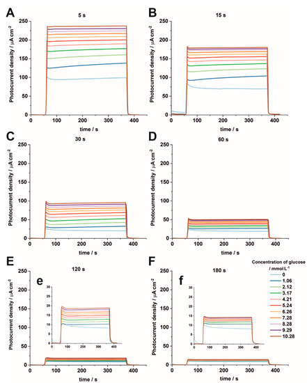 It can be seen from Figure 10 that the highest changes in the photocurrent with increasing concentrations of glucose are observed for Fe2O3–TiO2 electrodes obtained by electrodepositions carried out for 5 s (A) and 15 s (B). For samples electrodeposited for longer durations (Figure 10 C–F), the irradiated electrodes generate smaller photocurrent densities, but it can be still noticed that, in the solutions containing higher concentrations of glucose, the photocurrent density increases, such as for the impregnated sample. Additionally, the steady-state photocurrent is reached.