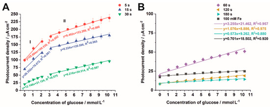The calibration plots were constructed from the points at t = 350 s (with 5% error marked) from Figure 10. For samples deposited for 5 s to 30 s, two linear regions, namely I (at a low concentration range of 1.06–2.12 mM) and II (at a high concentration range of 3.17–10.28 mM), which demonstrated the best linearity, were fitted to the experimental data (Figure 11A). However, for samples deposited for a longer time and for the impregnated sample, one linear region can be found (Figure 11B). For the linear regions of the calibration plots, the sensitivity and the limit of detection (LOD = 3Sb/m, where Sb is the standard deviation of the blank signal and m is the slope of the calibration curve), and the limit of quantification (LOQ = 10Sb/m) were calculated. As the deposition time increases, the sensitivity of the method estimated for the lower concentration range (range I), as well for the higher concentration range (range II), decreases respectively, from 29.88 µA mM−1 cm−2 and 8.49 µA mM−1 cm−2 for the sample electrodeposited for 5 s to 12.15 µA mM−1 cm−2 and 6.22 µA mM−1 cm−2 for the sample electrodeposited for 30 s. For the samples electrodeposited for 60–180 s, the sensitivity decreases from 3.26 µA mM−1 cm−2 to 0.57 µA mM−1 cm−2. It can be seen that the highest sensitivities were found for the electrodes prepared for the samples electrodeposited for 5 s and 15 s, and they were even better than those obtained by Liu et al. [52] for Fe2O3 nanoparticles on fluorine-doped indium oxide (FTO), which are equal to 17.23 µA mM−1 cm−2. The calculated LOD and LOQ values are collected in Table S2 in Supplementary Materials. It is worth noticing that both LOD and LOQ values decrease with increasing electrodeposition time used for the formation of iron oxide particles on the TiO2 surface. Taking into account the above-mentioned characteristics of the tested electrodes, namely the sensitivity, LOD, and LOQ values, the best electrode for PEC detection of glucose turned out to be that prepared from the sample electrodeposited for 5 s. A comparison of the results obtained for the sample electrodeposited for 5 s with those found in the literature for different kinds of Fe2O3 materials [52,53,54,55,56] is presented in Table S3 in Supplementary Materials. The proposed sensor is distinguished by its sensitivity compared to those in other works.