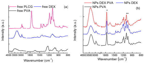 The spectra of free surfactants (Figure 1a) show the typical vibrations of these compounds, as reported in the literature for PVA and DEX—C–Hx, C–O, and O–H vibrations [36,37].