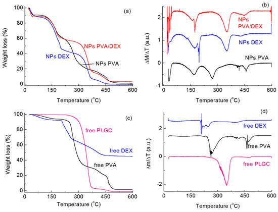 However, the thermal behavior of PLCG changes when it is in the form of NPs depending on the surfactant(s) used in the NPs preparation. From Figure 2a,b, it can be seen that thermal degradation takes place over several different steps. For all systems, a signal can be observed for T < 50–70 °C, which corresponds to the desorption of water molecules and whose intensity depends on the amount of solvent desorbed.
