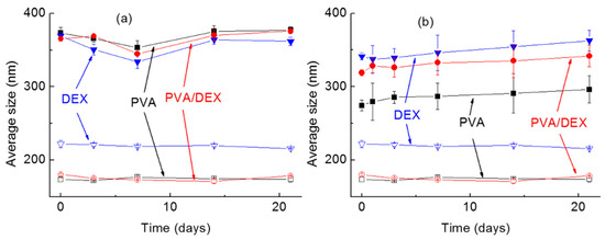 Average dimensions of the NPs over time (up to 21 days). In the graph, the hollow symbols correspond to the empty NPs while the full ones to the NPs loaded with (a) DOXO and (b) SN-38. ■: PVA; ▼: DEX; ●: PVA/DEX.