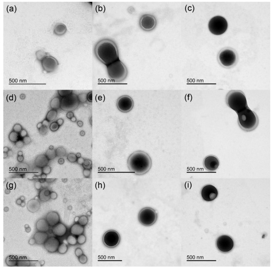 TEM micrographs of the different NPs: (a) PVA, (b) PVA with DOXO, (c) PVA with SN-38, (d) DEX, (e) DEX with DOXO, (f) DEX with SN-38, (g) PVA/DEX, (h) PVA/DEX with DOXO, (i) PVA/DEX with SN-38.