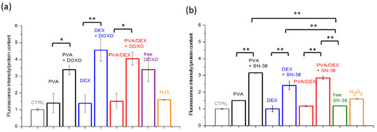 It is known that anticancer drugs, in addition to their antiproliferative effect, induce directly or indirectly oxidative stress [44,45]. Thus, to evaluate the production of reactive oxygen species (ROS) upon internalization and metabolization of the two drugs, the DCF assay was performed. MCF-7 cells were incubated with the three types of NPs at a drug concentration below the IC50 value (1 µM and 100 nM in the case of DOXO and SN-38, respectively). The results are presented in Figure 5a; they show that both drug treatments cause an increase in the intracellular ROS level, and the effect is more remarkable in the case of DOXO. Indeed, the cells administered with PVA/DEX and DEX NPs loaded with DOXO display an increase of the fluorescent signal of about 4 and 4.5 times, respectively, compared to control samples. In the case of the free drug and of the NPs prepared with PVA, a smaller increase in the fluorescence is observed (up to 3.4). Moreover, the images in Figure 6 show brightly fluorescent rounded cells in the samples incubated with either free or encapsulated DOXO. These results are in agreement with those of the viability assay.