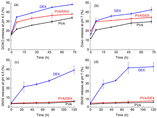 Considering the release curves of the SN-38 loaded nanoparticles (Figure 7c,d), interestingly, a very limited release of the drug at both pH values in the case of PVA- and PVA/DEX-coated NPs can be observed. Indeed, the two curves exhibit a flat profile reaching a maximum of 5% and 6.5% release after 5 days, respectively. On the other hand, the DEX-coated nanoparticles show a time-dependent behavior with 25% release after 24 h and a maximum release equal to 50% at pH 7 and almost 40% at acidic pH after 5 days. These data indicate that the interactions SN-38 establishes with PVA are stronger than those with DEX, thus hindering the release of the drug from the nanoparticles prepared with PVA, either alone or combined with DEX. Such limited SN-38 release was not observed with other NPs prepared using PVA; the literature data, for instance, report that SN-38 releases up to 60% for PLGA-based NPs [46]. On the other hand, in another study, PEG-PLA nanoparticles showed release kinetics inversely dependent on the length of the PLA chain, with the shorter polymer being the best performing (almost 40% release) up to 5 days [47]. Our results may indicate that both the polymer and the surfactant, and the combination of the two, affect the interaction with the drug and, hence, its release. This complex topic may need a more detailed investigation.