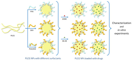 Illustration of the polymeric components of the NPs (the light yellow, light blue and orange curved lines correspond to PLCG, PVA and DEX, respectively), of the drugs (the red and green triangles correspond to DOXO and SN-38, respectively) encapsulated within them and of the main steps of the work.