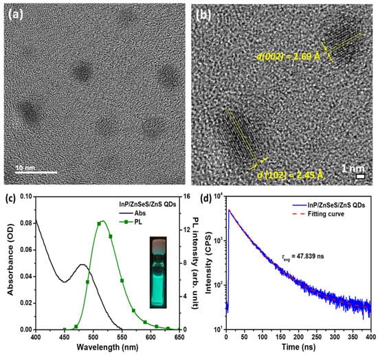 The use of light-emitting diodes (LEDs) for lighting and display has rapidly increased, because LEDs are more energy efficient than traditional lighting lamps [,,]. As novel materials for next-generation displays, quantum dots (QDs) have many advantages such as tuned wavelength, high efficacy, and color purity [,]. Cadmium (Cd)-based QDs have excellent photophysical properties. Unfortunately, the Cd element poses environmental concerns according to the specification of the European Restriction of Hazardous Substances (RoHS). By comparison, light-emitting materials for display applications based on indium phosphide (InP) are compliant with RoHS standards. Although InP-based QDs are suitable for commercial display applications, their crystallization behavior, optical properties, and stability are difficult to control synthetically [,]. Thus, the stability of InP-based QDs must be improved through other passivation structures.