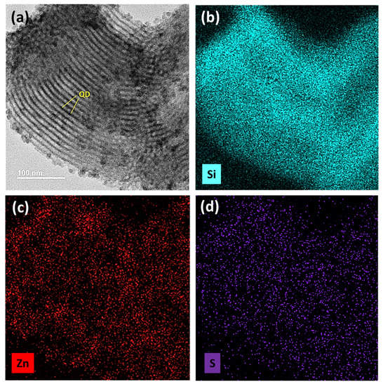 (a) The FETEM image of the SBA-15 MP/QD hybrid powder; (b–d) elemental Si, Zn, and S mapping images of the MP/QD hybrid powder, respectively, collected from the same location as (a).