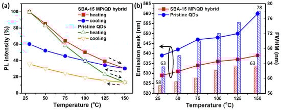 (a) Variations in the PL intensity ratio and the (b) emission peaks and FWHM of pristine QD powder and SBA-15 MP/QD hybrid powder during different measurement temperatures (the arrows in (a) indicate the testing temperature).