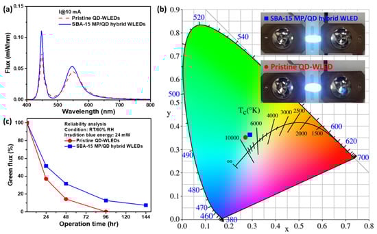 In this study, the optical performance of QD-WLEDs were tested using an integrating sphere system from Labsphere. The injection current of the WLEDs was kept at 10 mA (injection electrical power of 14 mW). The luminous flux, CIE 1931 color coordinates, and luminous efficacy of the two types of QD-WLEDs were evaluated using the aforementioned integrating sphere system. Figure 5a shows the electroluminescence (EL) spectra of the prepared QD-WLEDs, which were measured under current at approximately 10 mA. Under an operating current of 10 mA, the CIE 1931 color coordinates of the pristine QDs and the SBA-15 MP/QD hybrid WLEDs were (0.27, 0.35) and (0.29, 0.36), respectively, as shown in Figure 5b. The pristine QDs and the SBA-15 MP/QD hybrid WLEDs exhibited a luminous efficiency of 74.8 and 85.4 lm/W, respectively. Therefore, the luminous efficacy of the SBA-15 MP/QD hybrid WLEDs was enhanced by approximately 14% compared with that of the pristine QD-WLEDs under similar color coordinates. Moreover, all QD samples of the QD-WLEDs were placed in an environment at room temperature with a relative humidity as high as 60% to confirm further the synergistic effect of light, water, and thermal stability on reliability analysis (RA). The two-type QD-WLEDs were continuously irradiated with 24 mW of blue energy (current under 10 mA) under RA measurement. As shown in Figure 5c, the SBA-15 MP/QD hybrid WLEDs showed a slower green flux decay rate than the pristine QD-WLEDs, confirming that their light, water, and heat stability were due to the SBA-15 MPs’ protection. After 144 h, the green flux of the pristine QD-WLEDs had fully decayed, whereas that of the SBA-15 MP/QD hybrid WLEDs maintained a 7.3% green flux of the initial value. The pristine QDs were protected by the SBA-15 MPs against photo-oxidation and thermal degradation even under high-energy irradiation and high temperature of the LED chip. These results demonstrated that the pristine QDs embedded into the SBA-15 MPs could enhance the luminous efficacy and stability of QD-WLEDs for QD-on-chip applications. This study also further promoted the progress in the application of SBA-15 MP/QD hybrid WLEDs in many fields such as solid-state lightings and displays.