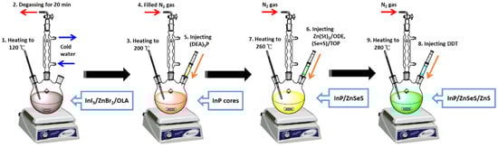 - Lim, J.; Bae, W.K.; Lee, D.; Nam, M.K.; Jung, J.; Lee, C.; Char, K.; Lee, S. InP@ ZnSeS, core@ composition gradient shell quantum dots with enhanced stability. Chem. Mater. 2011, 23, 4459–4463. [Google Scholar] [CrossRef]