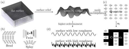 Schematic of this research. (a) A cholesteric liquid crystal tends to have a wrinkled surface rather than a flat surface driven by the director field (short lines) and the gradient of the director field. (b) The gradient of the director field shows three primary elastic modes: splay, bend and twist. (c) The wrinkling surface is the summation of various simple wrinkling modes, whose contributions are integrated into the -matrix of fundamental wrinkling modes (shown in Equation (15)). (d) The higher-order moment of the wrinkling surface characterizes the surface roughness.