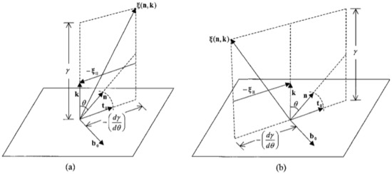 where is the surface projection tensor. The physical interpretation of Equation (4) is demonstrated with Figure 4; for simplicity, we only consider a quadratic anchoring model. In Figure 4a,b, the tangential component of the Cahn–Hoffman capillary vector gives the direction where the rotation of the surface unit normal around results in the fastest rate of decreasing anchoring energy.