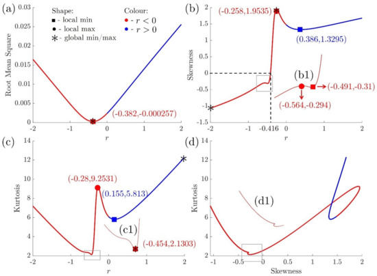 If , the relationship between the roughness parameter and r is given by Figure 7, and the root mean square increases when increases. If , the skewness profile presents two local minima and two local maxima due to the competition of the , and -modes (Equation (15)), shown in Figure 7(b,b1). The kurtosis profile only presents one local maximum and two local minima for the same reason. The skewness and kurtosis profiles present rich complexity for compared with . The opposite signs between the quadratic term and the quartic term result in a more complicated surface energy profile (the second and fourth quadrants in Figure 3), further creating various behaviours in the surface roughness parameters. Figure 7d presents the skewness-kurtosis plot, which is a prevalent tool in the application of lubrication [85,86], flows [87,88] and boundary layer analysis [89]. Figure 7d demonstrates a global binary plot with a single loop within , showing the complex coupling phenomenon of the two roughness parameters due to the lack of a dominant term for and in Equation (6) to Equation (8).