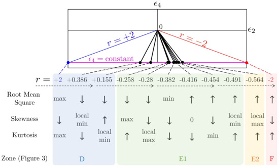 Summary of the parametric sensitivity of the key surface roughness metrics: root mean square, skewness, and kurtosis (Equations (17) and (18)). A straight line with slope passing through the origin in the parametric space corresponds to a morphology (evaluated by -matrix), and its y-axis coordinate (purple line ) determines the amplitude of the wrinkling profile. The location of these r-points in parametric space (Figure 3) are: , zone F; , zone E2; to are in zone E1; and to are in zone D. The density of the special surface roughness metrics in the negative r-value interval indicates that zone E1 in Figure 3 is a highly sensitive area.