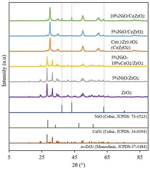 ZrO2 was prepared via precipitation. ZrCl4 was dissolved in water to form a 0.5 M solution, which was precipitated with a basic solution containing 25 wt.% NH4OH at pH 9 and a temperature of 60 °C, and then aged by stirring. The precipitate was washed several times using deionized water, dried at 105 °C, and calcined in air at 800 °C for 6 h. An aqueous solution of Ni(NO3)2·6H2O and/or Ce(NO3)3·6H2O was impregnated into the ZrO2 support via classical incipient wetness impregnation to form 5%NiO/ZrO2 and 5%NiO-10%CeO2/ZrO2. The resultant samples were dried at 105 °C overnight, and calcined in the air at 700 °C for 6 h.
