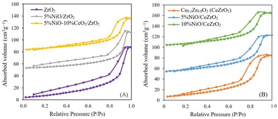 In Figure 2A, the NiO catalyst supported on ZrO2 exhibits a type IV isotherm, corresponding to the classification of mesoporous solids, where this classification describes monolayer-multilayer adsorption on the mesoporous walls. Mesoporous solids have pore diameters in the range of 2–50 nm. In this phenomenon, loop hysteresis occurs because of capillary condensation in the mesopores. In Figure 2B, the isotherm of the CeZrO2-supported NiO catalyst is also type IV. The N2 physisorption results for the CeZr sample also agreed with the results reported by Deng et al. [] and Singha et al. [].