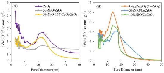 The pore size distribution profiles of the ZrO2- and CeZrO2-supported NiO catalysts under isothermal conditions are shown in Figure 3. Figure 3A shows that the size of the pores in the bare ZrO2 support range from 2 to 45 nm, with an average pore size of 18.54 nm and a total pore volume of 0.135 cm3 g−1. The addition of 5wt.% NiO to the ZrO2 support widens the pore size range when compared with that of the bare ZrO2, with a larger average pore diameter of 22.16 nm and total pore volume of ca. 0.095 cm3 g−1 being obtained for the supported catalyst. This larger pore size is probably caused by the calcination carried out twice, which causes NiO and ZrO2 to agglomerate and aggregate. Meanwhile, CeO2 impregnation in the 5%NiO/ZrO2 catalyst results in a narrow pore size distribution, with a smaller average pore size of 7.73 nm and total pore volume of ca. 0.047 cm3 g−1. This is due to the presence of a CeO2 component that fills the pores of the ZrO2 support, resulting in a decrease in the pore diameter and volume of the catalyst.