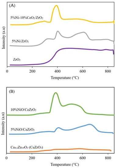 H2-TPR profiles of catalyst: (A) ZrO2-supported Ni catalyst and (B) CeZrO2-supported Ni catalyst.