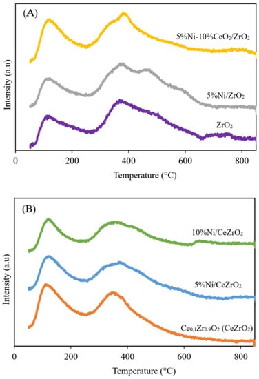 CO2-TPD was performed to determine the basicity of each catalyst by measuring the number of absorbed CO2 molecules on the surface. If CO2 is mostly desorbed at high temperatures, then the basicity of the catalyst is high because CO2 is an acidic probe. However, if CO2 is desorbed at low temperatures, then the basicity of the catalyst is low. The desorption of CO2 from the catalyst can be divided into three parts: At temperatures between 100 and 200 °C (first section), 250 and 420 °C (second section), as well as 580 and 760 °C (third section), indicating weak, medium, and strong basic sites on the surface of the DRM catalyst. The desorption peak of the catalyst, indicating weak basic sites, is related to the adsorption of CO2 by Lewis acid-base pairs []. The results of CO2-TPD for the ZrO2- and CeZrO2-supported NiO catalysts are shown in Figure 5.