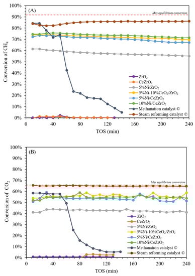Conversion of reactant on a ceria-zirconia-supported nickel catalyst: (A) CH4 and (B) CO2 (temperature of 700 °C, atmospheric pressure, WHSV 60,000 mL g−1 h−1).