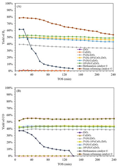 Figure 7 shows the H2 and CO yields for the synthesized and commercial catalysts. The 5%Ni/ZrO2 catalyst achieves average H2 and CO yields of ca. 36% and 39%, respectively. The impregnation of 10 wt.% CeO2 into the 5%Ni/ZrO2 catalyst increases the yields of H2 and CO, with averages of ca. 48% and 44%, respectively. The 10%Ni/CeZrO2 catalyst achieves average H2 and CO yields of ca. 51% and 43%, respectively, when compared with the 5%Ni/CeZrO2 catalyst, with yields of H2 and CO of ca. 46% and 43%, respectively.