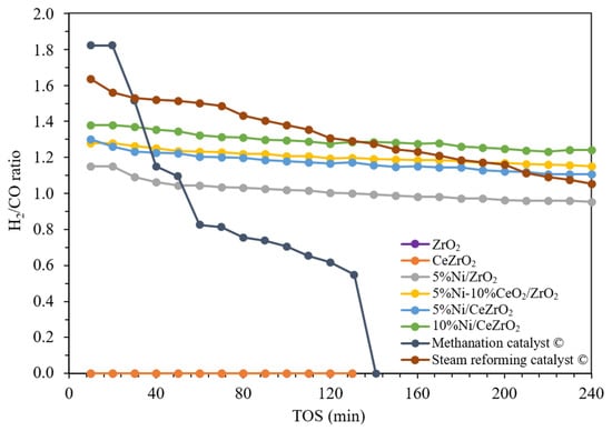 Ratio of H2/CO on a ceria-zirconia-supported nickel catalyst (temperature of 700 °C, atmospheric pressure, WHSV 60,000 mL g−1 h−1).