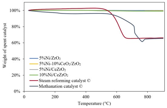 The TGA profiles obtained for the catalysts evaluated in the DRM (Figure 9) show that the commercial steam reforming and methanation catalysts experience a higher reduction in sample mass due to the combustion of the carbon that was deposited during the catalyst performance evaluation when compared with the synthesized catalysts.