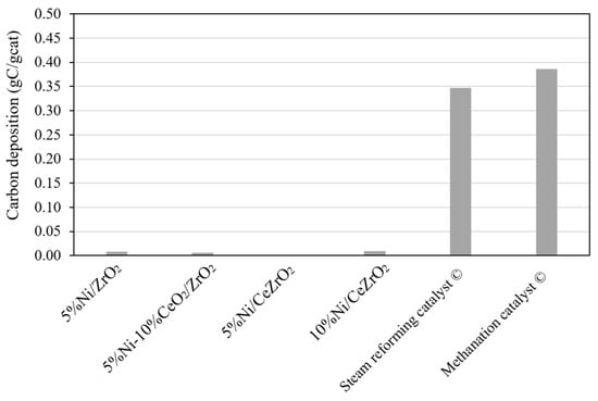 It can be seen that the amounts of carbon present in the commercial catalysts are much higher than those in the synthesized catalysts. The amount of carbon deposited on the commercial steam reforming catalyst is 0.347 gC/gcat after the stability evaluation during the DRM over 240 min. Meanwhile, on the commercial methanation catalyst, the amount of carbon deposited is 0.386 gC/gcat after the stability evaluation during DRM over 140 min. The amounts of carbon in the commercial catalysts are probably caused by the sintering of Ni and Al2O3, which causes the aggregation of Ni particles, resulting in enhanced carbon deposition on the catalyst []. The higher the amount of Ni in the catalyst, the more carbon is deposited on the catalyst. A large amount of Ni in the commercial steam reforming catalyst (25 wt.%) also reduces Ni dispersion, thereby increasing the chances of sintering []. To confirm the occurrence of sintering in the commercial catalysts, further analyses, such as high-resolution transmission electron microscopy, XRD, and/or N2 physisorption, are necessary.