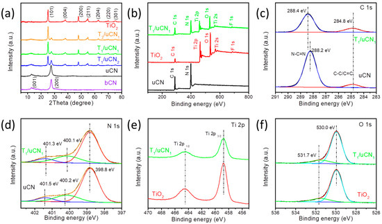 (a) XRD patterns of TiO2, uCN and T/uCN. (b) XPS survey spectrum of TiO2, uCN and T/uCN; high-resolution XPS spectra at the regions (c) C 1s, (d) N 1s, (e) Ti 2p and (f) O 1s.