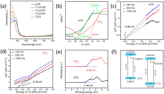 (a) UV-vis absorption spectra. (b) Kubelka–Munk-transformed function of TiO2, uCN and T1/uCN1. (c,d) Mott–Schottky plots of uCN (c) and TiO2 (d). (e) Valence band XPS spectrum of TiO2 and uCN. (f) Diagram of the band structure of TiO2 and uCN.