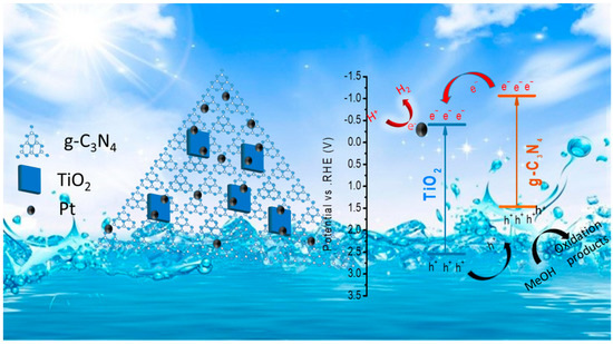 Based on the above results, the photocatalytic mechanism displayed in Figure 7 is proposed for hydrogen generation in T/uCN heterojunction photocatalysts. While both TiO2 and uCN can generate electrons and holes under simulated solar light irradiation, the photogenerated electron–hole pairs in pure TiO2 and uCN rapidly recombine, resulting in moderate HERs. Through the formation of a 2D/2D T/uCN heterostructure, the photogenerated electrons remain or are transferred to the TiO2 CB because the TiO2 CBM is located 0.53 eV below that of CN. Similarly, photogenerated holes remain or are driven to the uCN VB, which is located 0.93 eV above that of TiO2. Electrons at the TiO2 CB migrate to the platinum, which has a larger work function, thus a lower Fermi level, from where they are transferred to adsorbed H+ to produce H2. On the other hand, holes react with sacrificial methanol at the CN surface. Consequently, the photocatalytic hydrogen evolution process using sacrificial methanol can be described as follows: