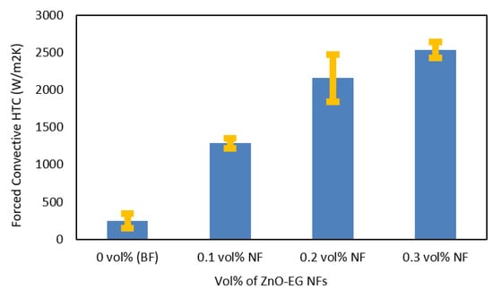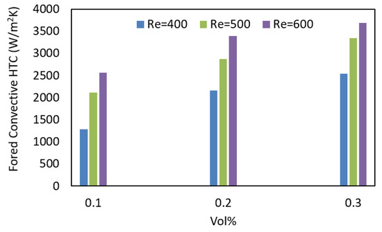 | Concentration (vol%) | Forced Convective HTC (Wm2/K) | ||