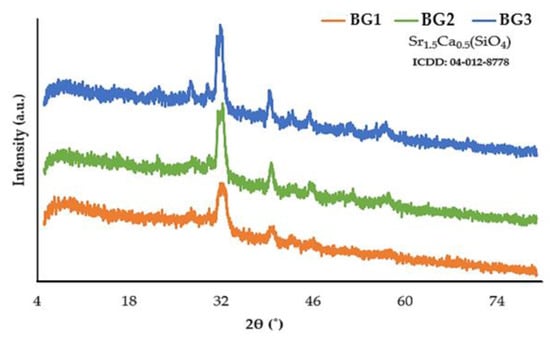 In order to determine the presence of crystalline phases and their composition, the powder samples of BG were submitted to XRD analysis after calcination at 700 °C. As seen from the XDR patterns (Figure 2), a broad and relatively low intensity peak can be observed in all BG samples due to the presence of a single crystalline phase, identified as calcium strontium silicate (Sr1.5Ca0.5(SiO4)). Interestingly, the XDR peaks tend to become sharper and have increased intensity when moving from BG1 to BG2 and BG3. Considering that the same experimental procedure was adopted in the preparation of all the BG samples, the observed differences can only be attributed to their compositional variations. It is worth mentioning that a simpler quaternary BG with a composition consisting of 60 SiO2—34 CaO—4 MgO—2 P2O5 (mol%) appeared to be completely amorphous after calcination at 700–800 °C when using a mixing period of 60 min over the entirety of the sol composition [32], as in the present work. The lower content of the main glass-network former (SiO2) in the present BG compositions is likely to lead to less polymerized and thermally stable glass structures, therefore making them more prone to devitrification when subjected to heat. This helps explain why the investigated BG samples calcined at 700 °C have undergone partial crystallization. Furthermore, their different devitrification extents can be attributed to the various content and types of glass modifiers (CaO, MgO, SrO, CuO). The occurrence of liquid–liquid phase separation (LLPS) is a very common phenomenon in glasses containing different alkaline earth oxides, being ubiquitous to glass in general (e.g., Pyrex borosilicate glass) [38,39]. The presence of LLPS is unavoidable and sometimes desirable, as microscopic heterogeneities could be tuned to produce required properties [40]. The occurrence of partial glass crystallization in the present case may reduce the rate of BG degradation, which could be an advantage when the long-term presence of BG is desirable for the intended application.