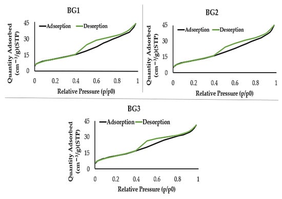 In order to evaluate the existence of pores and their structure in the particle surface of the BG samples, BET analysis was performed by the adsorption of N2. The adsorption and desorption isotherms curves (Figure 4) allow classification according to type of isotherm, which is related to pore structure, and according to type of hysteresis loop, which is related to pore characteristics and adsorption mechanism, according to IUPAC. The isothermal curves presented are of type II, associated with microporous materials with heterogeneous surfaces, accompanied by hysteresis loops of type H3, normally associated with type II isotherms, indicating the presence of a network of macro pores that were not completely filled [43].