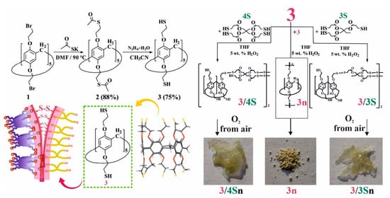 A total of 0.09 g (0.074 mmol) of pillar[5] arene 3 was dissolved in 6 mL of THF; then, 0.35 mL of polythiol (trimethylolpropane tris(3-mercaptopropionate) or pentaerythritol tetrakis(3-mercaptopropionate)) (or without for 3n) dissolved in 6 mL of THF and 1.2 mL of H2O2 (30%) dissolved in 6 mL THF was added. The reaction proceeded at room temperature for 40 h. Then the reaction mixture was poured into water and centrifuged. The resulting precipitate was dissolved in THF. Then, the precipitate was dried in vacuum under reduced pressure. The target product is a white, stretching mass.