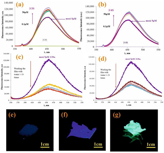 Fluorescence spectra of moxi (5 × 10−6 M) with various concentrations of: (a) 3/3S (0–50 μM) and (b) 3/4S (0–50 μM); (c) fluorescence spectra 3/3Sn/moxi and (d) 3/4Sn/moxi of the film before and after washing with distilled water; photographs of samples under UV irradiation at λ = 365 nm (e) 3n; (f) 3/4Sn; and (g) 3/4Sn + moxi after washing with water (five times).