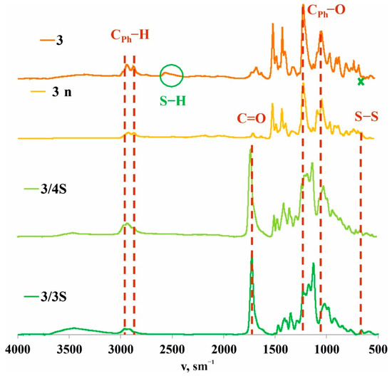 Electron paramagnetic resonance (EPR) was used to determine the presence of sulfur radicals in 3/3S, 3/4S, 3n, 3/3Sn, 3/4Sn structures, since free radicals have a nonzero electronic (spin) magnetic moment, characterized by a quantum number of S = 1/2 [55]. Figure 6b shows the steady-state absorption spectrum for the 3n powder sample at room temperature. Comparing the spectroscopic g-factor value with the literature data [54,55], it is obvious that sulfur radicals are present in the 3n (see SI, Figures S44 and S45) powder sample, which confirms the hypothesis put forward.