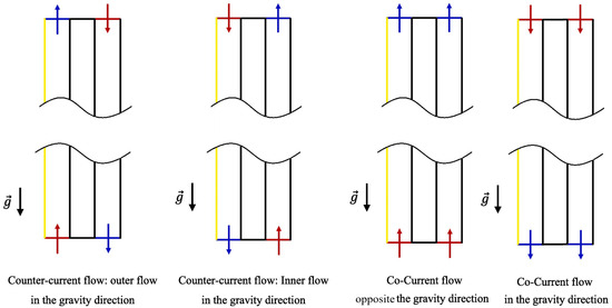 - co-current (both opposite gravity): the flow direction in inner and outer tubes are opposite to the gravity direction;