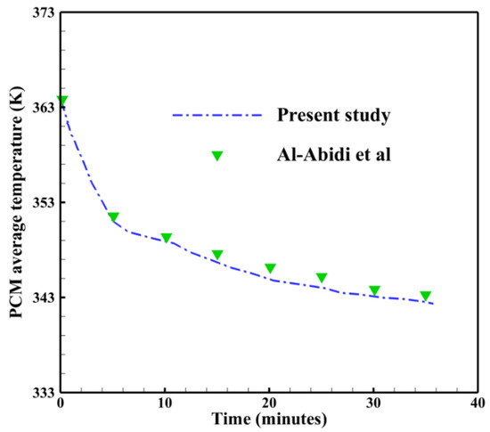 To validate the proposed applied model during the solidification process, the results of the current work are compared with the practical study of Al-Abidi et al. [47]. Al-Abidi’s study was a reliable experimental study that, on one hand, has been employed in several studies for validation, and on the other hand, presented all the details of the geometry and PCM used and therefore is suitable for regeneration of the geometry and validation study in this paper [64]. They examined the PCM thermal variation in a triplex-pipe PCM heat exchanger integrated with fins. As noted in Figure 4, there is a good agreement between the PCM mean temperature of the current work and those reported by Al-Abidi et al. [47]. This indicates that the present model accurately predicts the solidification process relative to the experimental data.