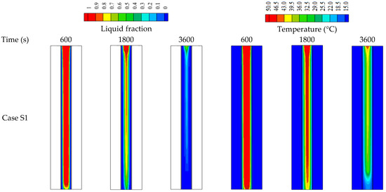 This section considers the effect of the HTF direction on the phase change process of the PCM. Table 3 shows the conditions of the flow direction of the HTF for cases S1–S4. In these cases, all the tubes are straight. Figure 5 shows the liquid fraction (the three images on the left) and temperature (the three images on the right) contours in different HTF directions. For all the cases, the area adjacent to the HTF channel walls was solidified first due to the convection heat transfer that generates between the wall and the PCM. The solidification process expands gradually as more heat is exchanged in the system. The centreline of the PCM container and the top part are the last regions that solidify due to the far distance from the wall and buoyancy effect, respectively. Within 3600 s, 97% of the PCM solidifies. The solidification process shows almost the same behavior for all the cases, confirming that the direction of the HTF has an inconsiderable effect on the phase change process. The temperature profiles show that the temperature drops in the regions besides the walls, causing a solidification in those areas. The more heat exchange between the PCM and the HTF through the wall, the more dropping in the PCM temperature reveals, consequently, a larger area of solidification. The average temperature of the entire PCM reached 23 °C within 3600 s. The contours of the temperature also indicate that the flow direction has a tiny impact on the phase change process, as the profiles are almost the same for all the cases.